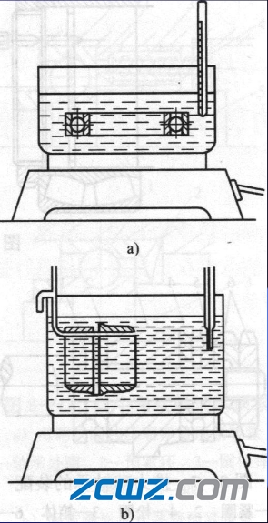 如果轴颈尺寸较大、过盈量也较大时,为装配方便可用热装法,即将轴承放在温度为80~ 100~C的油中加热,然后和常温状态的轴配合。轴承加热时应搁在油槽内网格上(图3),以避免轴承接触到比油温高得多的箱底,又可防止与箱底沉淀污物接触。对于小型轴承,可以挂在吊钩上并浸在油中加热。内部充满润滑油脂带防尘盖或密封圈的轴承,不能采用热装法装配。