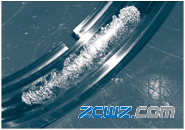 如果滑油中含有硬质颗粒,不仅可以造成磨粒损伤,还可能会造成滚动体和滚道表面的压痕。此外,装配与拆卸轴承、整机及其部件工作或运输中的过度冲击都有可能造成滚道或滚动体表面的压痕。出现压延印痕,会增大轴承的噪声,并且在印痕边缘产生超应力(即边缘效 应),从而成为疲劳剥落的起始点,还可能使轴承游隙消失,旋转时卡死。