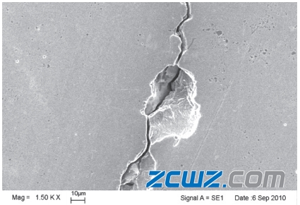 图4所示为轴承套圈上的碳化物形貌。由于碳化物、氧化物等夹杂物的韧性差,并且与周围基体材料之间形成分明的界面,当其尺寸较大且存在于轴承工作表面与次表面之间时,受到挤压后容易碎裂,其周围边缘若干凹沟处受到两边凸出材料的频繁挤压与松弛很容易产生疲劳裂纹,从而成为剥落起始点。