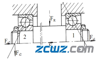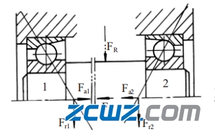 在轴承组合中求轴承所受的轴向载荷,可首先求得内部轴向力,然后根据内部轴向力与外载荷判断各轴承受载的特点,分析其是受轴向载荷与径向载荷共同作用,还是只受纯径向载荷的作用,然后即可根据式(1)与式(2)求得轴向载荷。