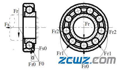 当轴承内圈在轴心处受由外圈的窄边指向宽边方向的轴向外载荷 FX 作用,且在外圈支反力作用下处于平衡时,轴承被压紧,轴承中各滚动体所承受的载荷大小相等,方向均为接触点处的法线方向,各滚动体所受支反力合力的作用点位于轴心,与且与 FX 大小相等,方向相反。当轴承内圈在轴心处受由外圈的宽边指向窄边方向的轴向外载荷 FX 作用时,轴承被放松,各滚动体不受轴向力的作用。故根据轴承的压紧与放松状态即可判断出其是否受轴向外载荷的作用。