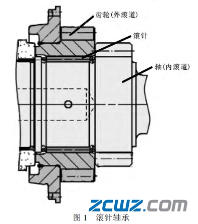 在变速器中,滚针轴承的作用是支撑轴上的游动齿轮。其中,轴的外径相当于滚针轴承的内滚道,齿轮的内孔相当于滚针轴承的外滚道,内、外滚道与滚针和保持架一起组成了一个完整的滚针轴承。(如图1所示)。