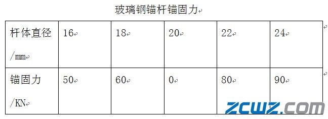 全螺纹玻璃钢锚杆的抗拉强度≥245MPa,抗剪强度≥6MPa,扭矩≥41N•m。全螺纹玻璃钢锚杆使用树脂锚固剂,在锚固长度为380±50mm时,其锚固力达到50—90KN,如表5-3所列。