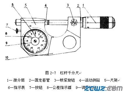 如图2-5所示,图中1是尺架,尺架的左端装有固定的测砧2,另一端装有测微螺杆3。尺架的两侧面上覆盖着隔热装置8,以防止使用时的手温传给千分尺,影响测量精度,尺架的右端有固定套筒4,套筒表面上有刻度。转动锁紧装置7可锁紧3固定不动,当测策螺杆3与测砧2接触时即停止前进。