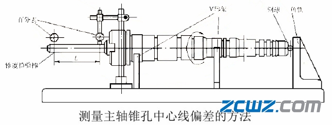 检测时,将主轴轴颈置于V形架上,轴向用钢球支撑在角铁上,在主轴锥孔中插入检验棒,把百分表分别支在近主轴端及距轴端L处,转动主轴测出锥孔中心线的偏差方向,并作好标记。