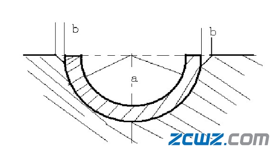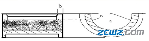 b、油槽带分布在上、下轴瓦结合部位处 (两侧)。如图3所示。油槽带成圆弧楔形,瓦口结合面处向外侧深度一般在1 ~ 3mm。视轴瓦的大小,油槽带宽度h-般为8 ~ 40mm。油槽带单边距轴瓦端面的尺寸b一般为8 ~ 25mm。上述要求通常在图样上明确标出。油槽带的长度为轴瓦轴向长度的85%左右,是一个能存较大量的润滑油的带状油槽,便于轴瓦与轴的润滑与冷却,油槽带通常由机械加工而成,也有钳工手工加工的。