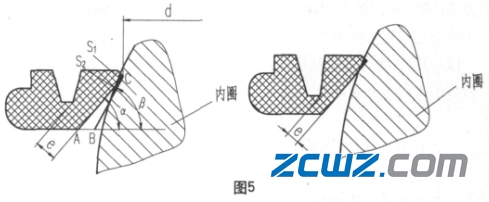主要是采用减少密封圈唇部与内圈球面的过盈量来处理,即加大密封圈内径d(见图5),使密封圈唇部与球面接触量减少。其次是减少密封圈的腰部尺寸e,让密封圈唇部更有弹性,减少密封圈与内圈球面的接触压力。另外在密封圈设计时,张开角α不宜太大,从图5可以看到,张开角从α到β逐渐加大,直线距离就从A点到B点,直线BC与内圈接触面积为S1+S2比直线AC与内圈接触面积S1整整大了S2的接触面积。