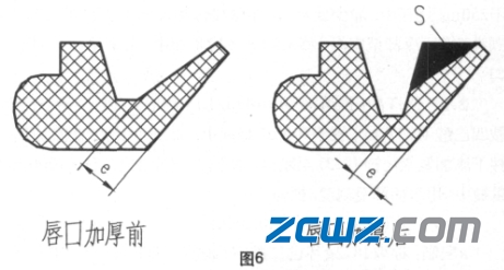 对于这种现象,主要解决方法是减少密封圈唇部与内圈球面的过盈量;其次是适当增大密封圈内唇部的刚性和弹性,即加大唇口部分的厚度(见图6阴影部分S)和减小密封圈腰部尺寸e。只有密封圈的唇口有足够的刚性和弹性,在轴承摆动时才不会发生反咬。