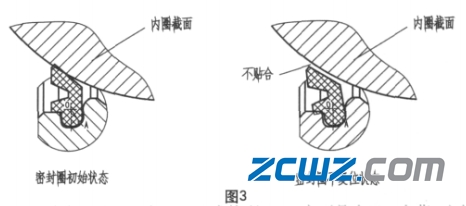 ③轴承密封圈不复位造成的喇叭口,密封圈在轴承摆动过程中,其头部A点卡在密封槽内,不能回到原始状态(见图3),须减小密封圈外径尺寸或减小密封圈头部宽度尺寸。