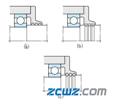 ②甩油环设在端盖内侧时(图d),产生由外向内的泵吸作用,有利于防止润滑剂泄漏,设在外侧时(图e),产生的泵吸作用相反,有利于防止外部异物侵人。